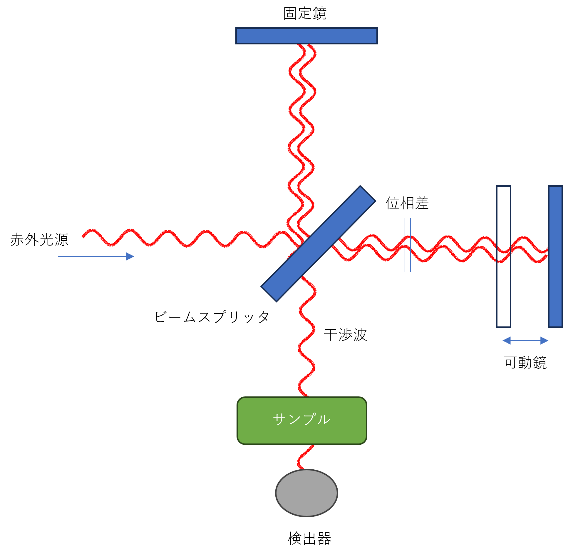 FTIRは赤外光を用いて物質の分子振動を調べる分析手法です。光源から放射された広帯域の赤外光を干渉計に通し、可動鏡の位置を変えながら光の干渉波(インターフェログラム)を取得します。干渉計では赤外光がビームスプリッターで二つに分割され、一方は固定鏡へ、もう一方は可動鏡へ送られます。二つの光はそれぞれの鏡で反射されて再びビームスプリッターに戻り、位相差のある光として合成されます。この合成光を試料に当て、透過もしくは反射した光を検出します。その干渉強度パターン(インターフェログラム)をフーリエ変換することで、各波長(波数)成分の吸光度スペクトルが得られます。これにより試料がどの波長の赤外を吸収するかがわかり、分子中の官能基に対応する振動モードを特定できます。
