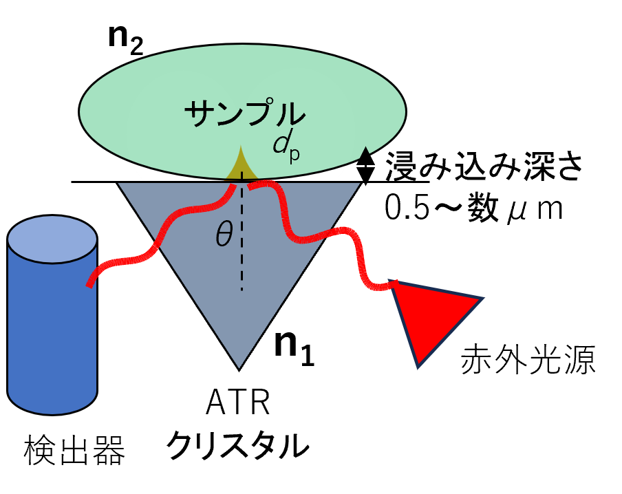 ATR法(全反射法):屈折率の高いATR結晶(ダイヤモンド、ゲルマニウム、シリコンなど)に試料を密着させ、結晶表面で全反射させた赤外光のエバネッセント波が試料表面に数μm侵入する現象を利用します。ATR法は試料の厚み制限がなく固体表面をそのまま測定できる利点があり、特に固体の非破壊的な分析に有効で、最も一般的なFTIR測定手法です。