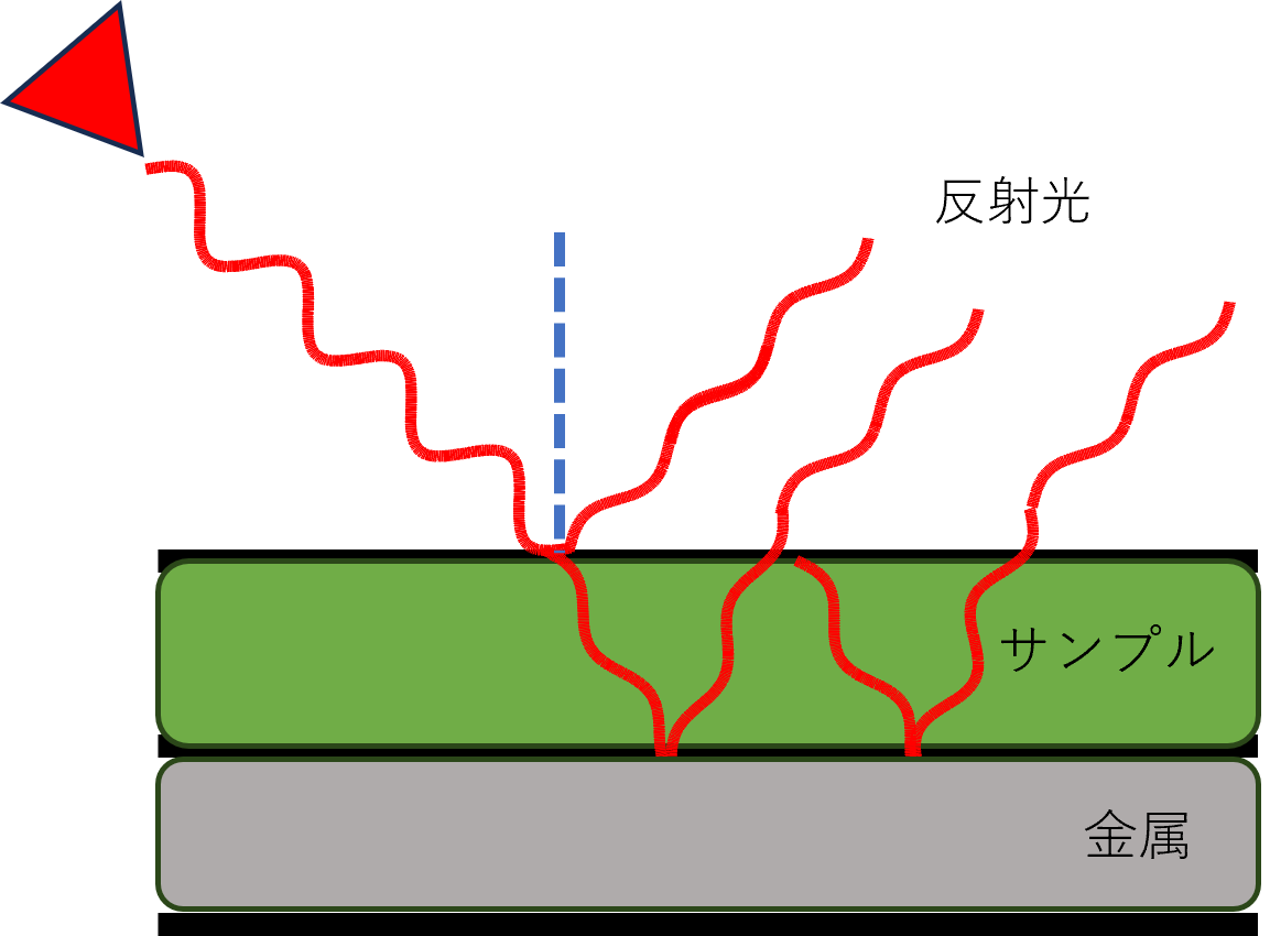 反射吸収法:金属上に付着した試料や、成膜されたサンプルに利用します。入射した赤外光は試料を透過し、金属で反射して、検出器に到達します。対象サンプルは十分に薄いか、微小である必要があります。 外部反射法:光が試料表面で正反射する外部反射法(鏡面反射)を利用し、反射スペクトルから間接的に分子振動の情報を得ることができます。サンプルを非破壊で固体表面のそのままの状態で測定できるため、厚いサンプルや不透明サンプルでも測定できます。