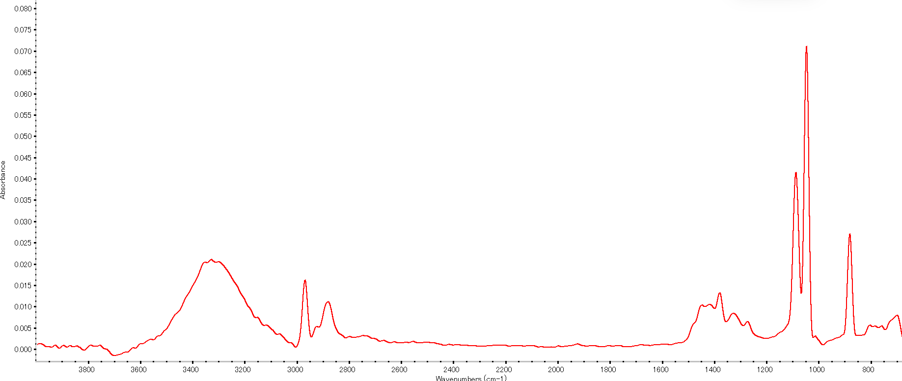上図はエタノール(CH₃CH₂OH)の赤外透過スペクトルの例です。波数軸は右端が600 cm⁻¹、左端が4,000 cm⁻¹で、縦軸は吸光度(Abs)です。3358 cm⁻¹付近に幅広い山が見られますが、これはOH基の伸縮振動に由来する吸収です。アルコールのOHピークはこのように非常に幅広い形状を示し、水素結合により中心波数がやや低下し幅が広がります。一方、2974 cm⁻¹や2887 cm⁻¹付近の比較的鋭いピークはC–H伸縮振動に対応します。エタノールにはメチル(–CH₃)とメチレン(–CH₂–)が含まれ、それぞれ不対称・対称振動で複数のピークを与えるため、約2,900 cm⁻¹付近に密集したピーク群が見えています。1455 cm⁻¹と1381 cm⁻¹付近のピークはCH₂・CH₃の変角振動に由来します。1090 cm⁻¹と1050 cm⁻¹付近のピークはC–O伸縮振動です。エタノール中のエーテル結合(C–O–H)がこの領域に特徴的な2本のピークを与えています。880–670 cm⁻¹付近には小さなピークがいくつか見えていますが、これは主にC–C骨格振動やC–Oの変角振動などに対応する指紋領域の吸収で、669 cm⁻¹のピークはエタノールに固有の吸収の一つです。
