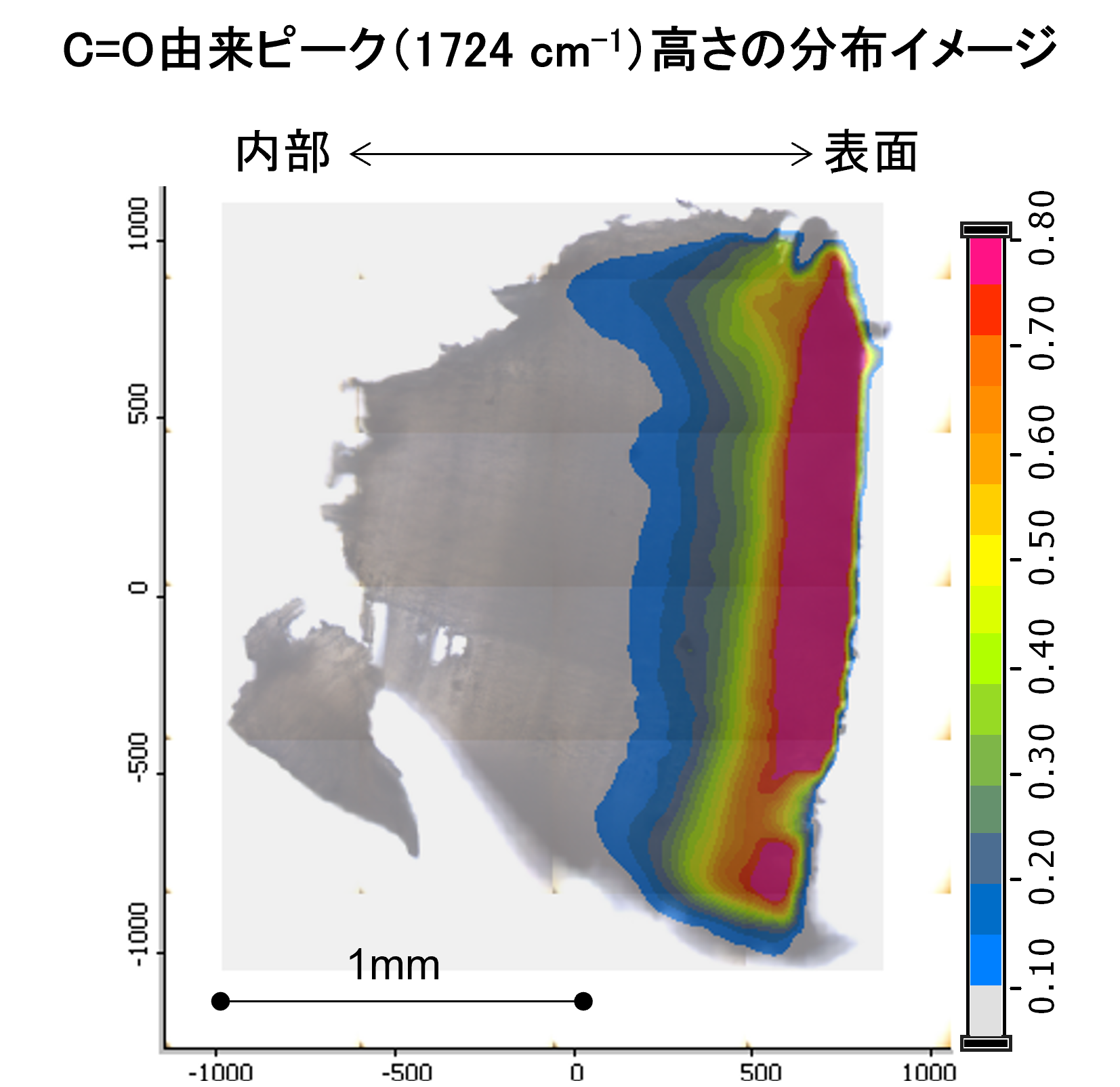 材料が酸化や熱分解などで劣化した場合、赤外スペクトルには新たなピークが現れることがあります。代表的なのがカルボニル基(C=O)の増加です。ポリマーが酸素と反応して劣化すると、エステルやケトン、過酸化物などのカルボニル化合物が生成し、1,700~1600 cm⁻¹付近の吸収が強まります。また紫外線劣化したポリエチレンでは、波数1780 cm⁻¹近辺に過酸化物由来のピーク、1740 cm⁻¹付近にエステル由来のピーク、1710 cm⁻¹付近にケトン由来のピークがそれぞれ観察されたとの報告があります。さらに酸化劣化ではO-H伸縮(3,400 cm⁻¹付近)のピークも増加しやすく、これはヒドロキシ基や吸着水の増加と関連します。一方、硫黄雰囲気下で劣化した場合にはスルホキシド基(S=O)のピークが1,030 cm⁻¹付近に現れることがあります。実際、アスファルト中のポリマー劣化評価では1,700 cm⁻¹のカルボニルピークと1,030 cm⁻¹のスルホキシドピークの強度比(酸化指数)を指標にする手法が知られています。このように、特定の劣化官能基のピーク強度をモニターすることで劣化の程度を定量評価することも可能です。またスペクトル全体の形状変化から、例えばプラスチック表面の酸化は深さ方向に徐々に減少する(表面でカルボニルが最大)といった情報も得られます。赤外顕微鏡を用いれば試料断面の深さごとにスペクトルを測定でき、劣化の深さ方向プロファイルを可視化することもできます。劣化解析ではこのようにカルボニル指数や特定ピークの深さ分布を読むことがポイントです。