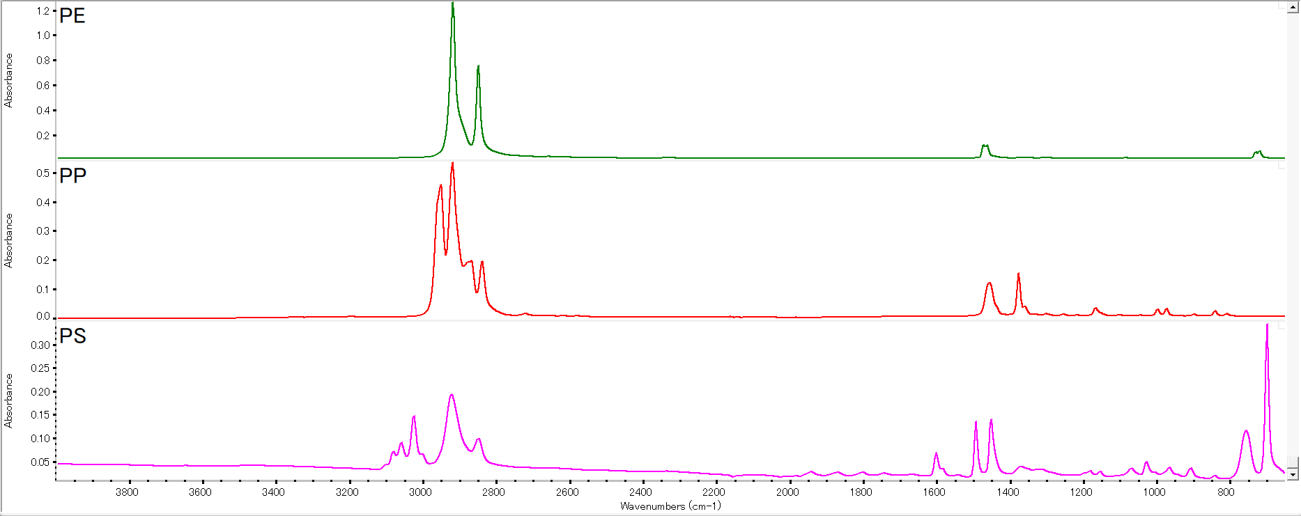 赤外スペクトルは高分子材料の種類を識別するのにも用いられます。例えばポリエチレン(PE)とポリプロピレン(PP)はいずれも炭化水素ポリマーですが、スペクトルには明確な差があります。PPにはメチル基が含まれるため、2,950–2,850 cm⁻¹領域に4本のC–H伸縮ピーク(CH₃とCH₂の対称・不対称振動)が立ちます。一方、ポリエチレン(PE)にはメチル基が無いため、この領域のピークはCH₂由来の2本のみです。また芳香族を含むポリスチレン(PS)では、3,000 cm⁻¹以上に芳香環C–Hのピーク(3本程度)と、1,600 cm⁻¹付近に芳香環C=C振動のピークが現れます。さらに698 cm⁻¹付近に大きなピーク(ベンゼン環の変形振動)があるのもPSの特徴です。このように、材料ごとにスペクトルの指紋が異なるため、スペクトルデータベースと照合することで未知試料が何の樹脂かを推定できます。FTIRではこのようなスペクトル形状の違いを検出し、プラスチックを自動判別する技術が使われています。