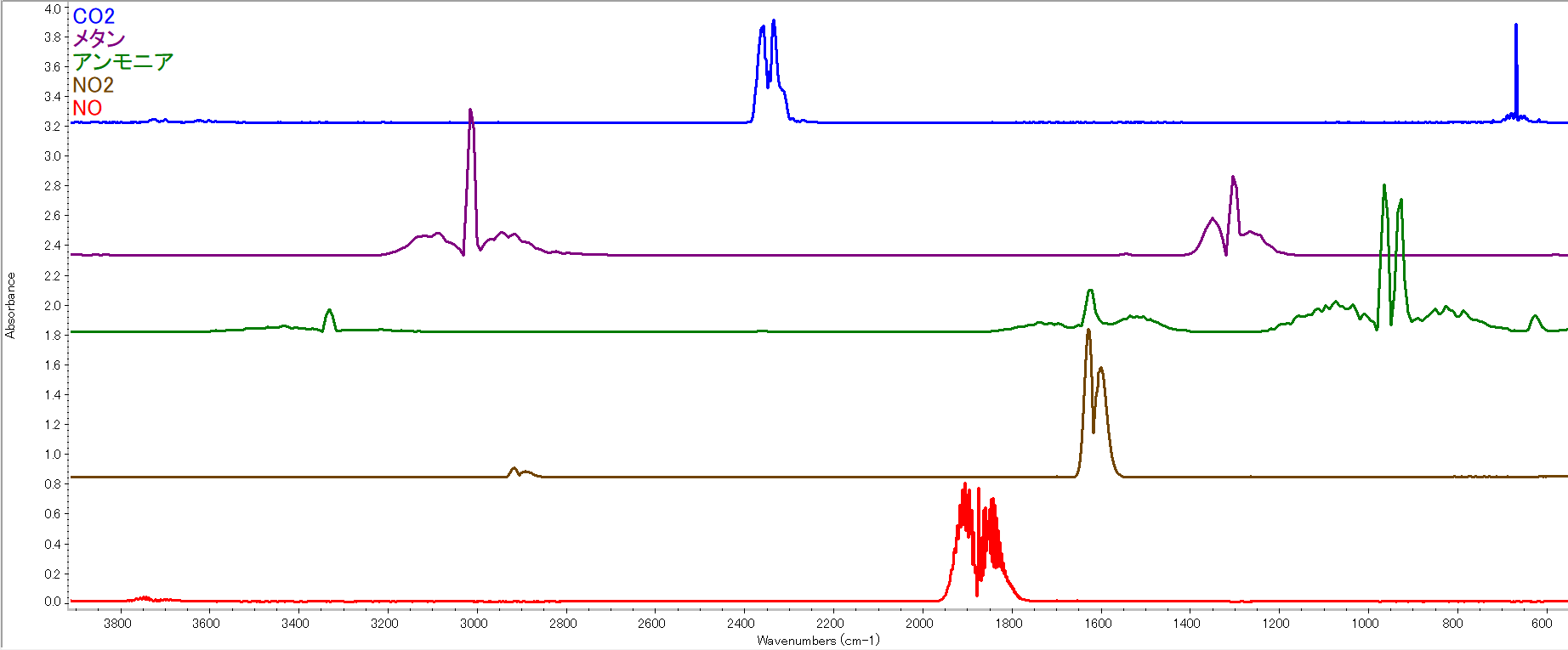 図1:ガス赤外スペクトル例(CO2、メタン、アンモニア、NO2、NO)
